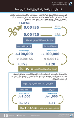 قرر مجلس هيئة السوق المالية تعديل عمولة شراء وبيع الأسهم برفعها من (0.00120) مائة وعشرون في المائة ألف (0.120%) أي ما يساوي (12) نقطة أساس، وهو ما يساوي 12 ريال لكل عشرة آلاف ريال من قيمة الصفقة إلى (0.00155) مائة وخمسة وخمسون في المائة ألف (0.155%) أي ما يساوي (15.5) نقطة أساس، وهو ما يساوي 15.5 ريال لكل عشرة آلاف ريال من قيمة الصفقة، كما تضمن قرار المجلس إلغاء الحد الأدنى للعمولة لأي أمر منفذ في السوق المالية يساوي أو يقل قيمته عن مبلغ عشرة آلاف ريال. وسيتم العمل بموجب هذا القرار ابتداءً من يوم الأحد 12/10/1437هـ الموافق 17/7/2016م